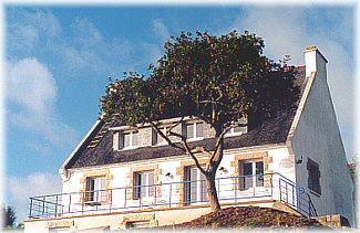 Großes Ferienhaus mit herrlicher Sicht auf die Rade de Brest. Wohnraum mit SAT-TV und großem rustikalen Eßtisch, Terrasse, sehr